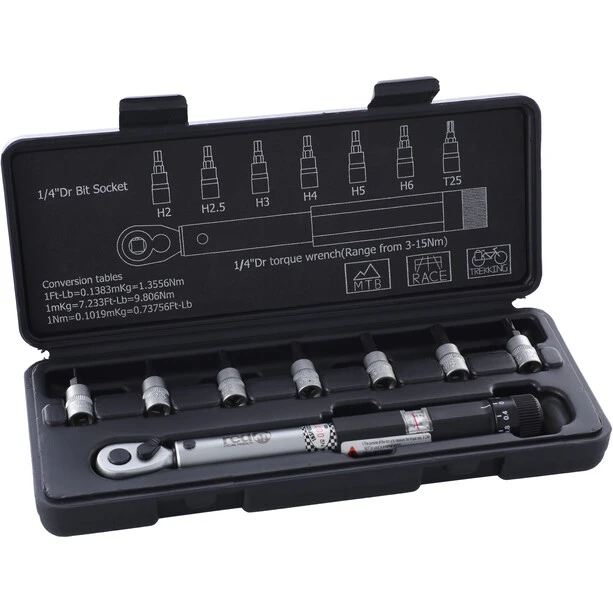 Professional torque wrench set including bits- for everyday use or in the workshop. The tool and the bits are made of high quality steel and very durable. The bit range of 3-15 Nm means that all the necessary work on a bike can be carried out. The tightening motion can be extremely and can be adjusted in increments of 0.5.