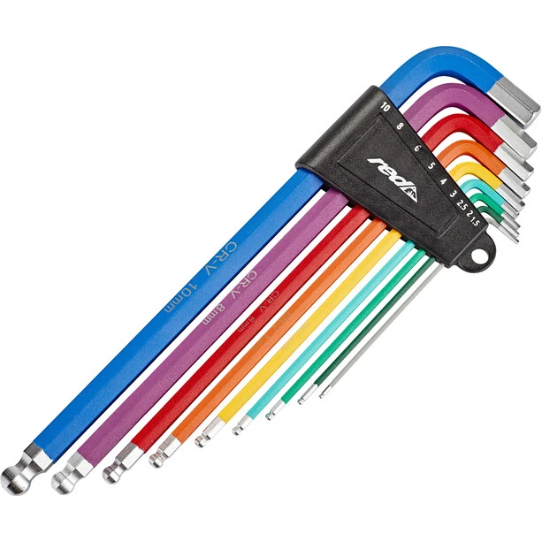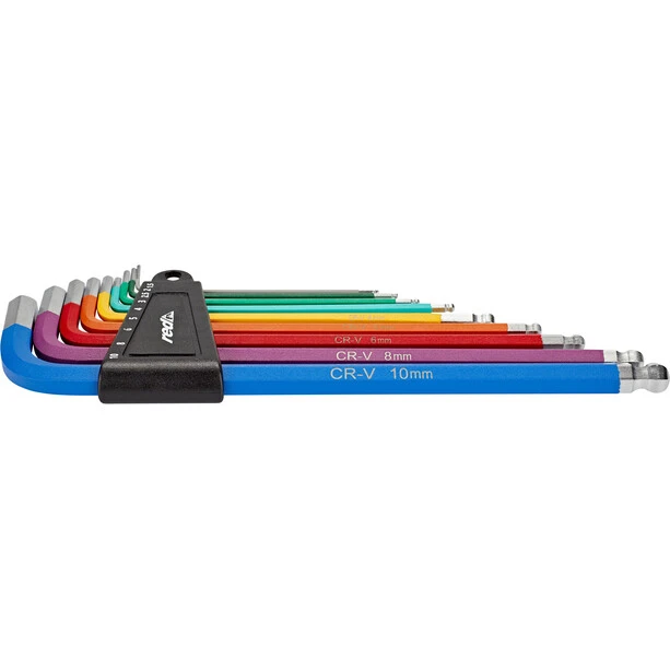 This set not only adds colour to your toolbox, but also helps you get the right size immediately. Or are you able to distinguish a 2.5 mm key from a 3 mm key with your naked eye? Thanks to the ball heads, you can even reach screws that are difficult to access. The set includes all the sizes you might ever need for your bike.