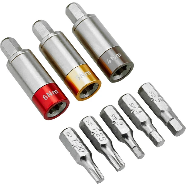 All in one! The Nano TorqBar is the narrowest and most compact torque wrench (preset) on the market! A precisely manufactured, high quality tool for the home mechanic, the professional bike shop or your own jersey pocket. Particularly suitable for high-tech carbon frames, components and electronic circuits that require exact tightening torque. Contains three preset TorqBits (4/5/6 Nm) and the 5 most important bits (3/4/5 mm/T20/T25). Two bits can also be stowed in the TorqBar handle for quick access and convenient transport.