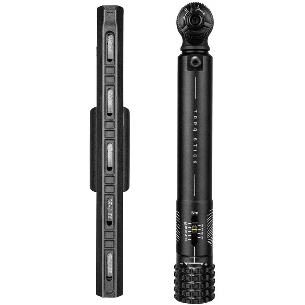 Incredibly compact torque wrench with adjustable torque range of 2-10 Nm. The switchable ratchet head with 1/4″ hexagonal bit receptacle and the pre-adjustable torque ensure secure tightening of most screw connections on frames and components. Included detachable organizer with viewing windows for five tool bits to find the right bit quickly and easily