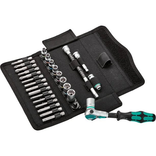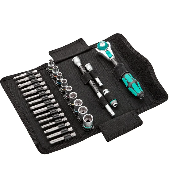 Incredibly compact set arrangement for a lot of tools in a small space. Completely new ratchet set feeling thanks to new textile boxes with very high robustness and durability. Can be positioned upright for clear storage on the workshop shelf. Additional surface protection thanks to textile outer material. Low weight and volume for easy mobility. With tool finder “Take it easy”: colour coding according to size.